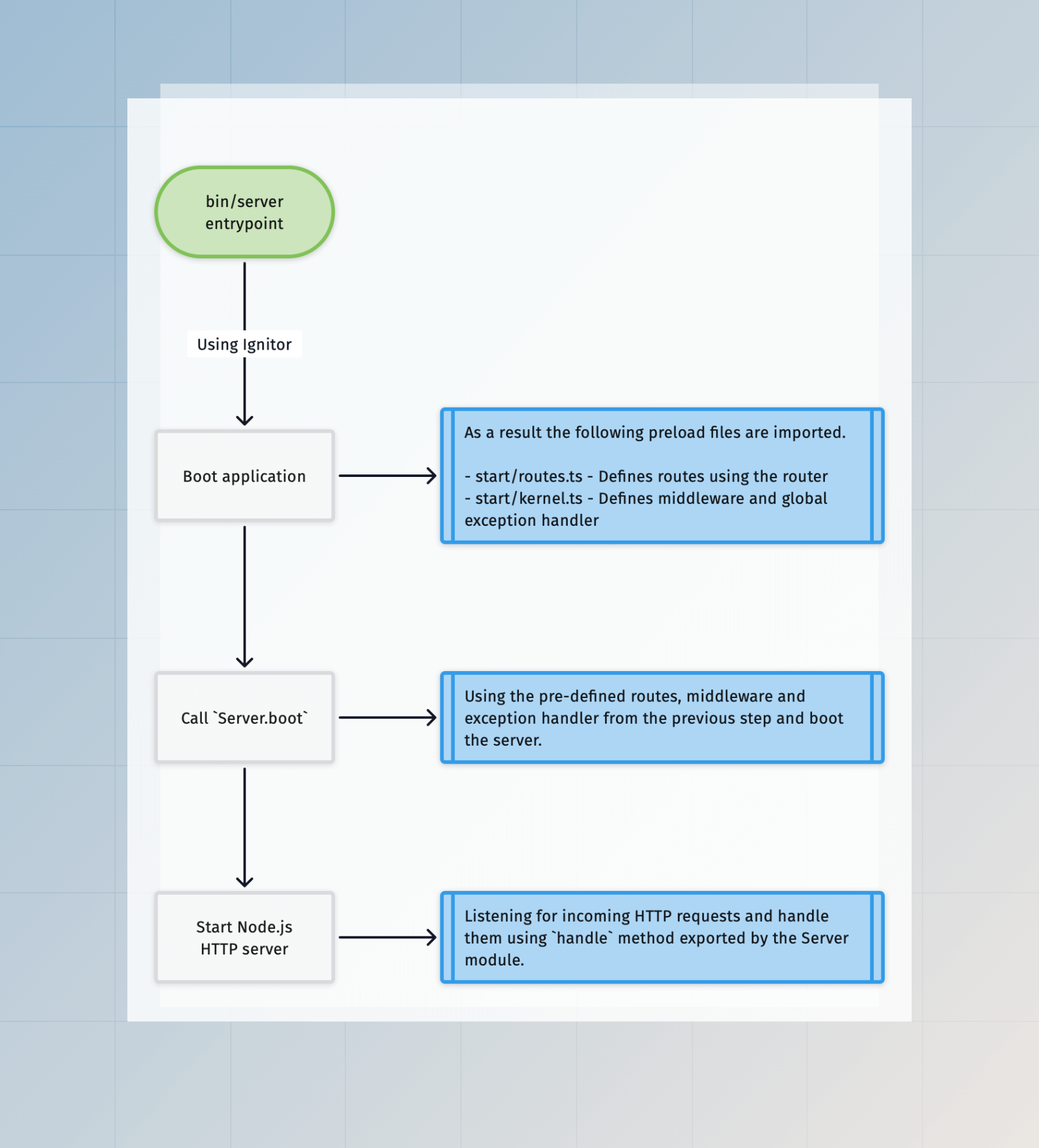 The HTTP server is booted once you call the boot method on the Server class. Under the hood, this method performs the following actions.